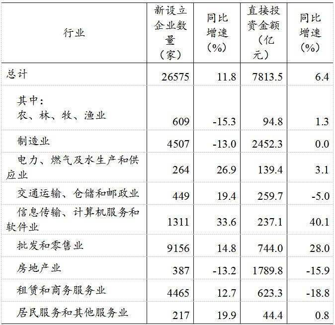 ②表中有幾個(gè)行業(yè)在新設(shè)立企業(yè)數(shù)和直接投資金額同比增速上均快于全國(guó)總體水平?