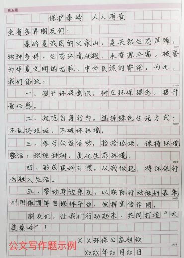(2)發(fā)文日期:注意用阿拉伯數(shù)字將年、月、日標全;書寫在“發(fā)文機關/署名”下一行,一般右空四格書寫,落款中兩個數(shù)字占一個格子。時間可以寫考試當天的日期,也可以寫為××××年××月××日的形式。