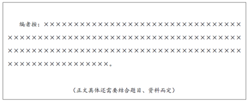 編者按一般是為了讓讀者通過這個說明看得更明白或者得到更多的信息而增加的一些特別的說明引導。這一公文的格式不同于其他公文,一般由標題與正文組成。其中,標題一般左空兩格直接寫為“編者按”,后加“:”,其后緊跟正文內容,正文內容的書寫格式與一般公文區(qū)別不大。