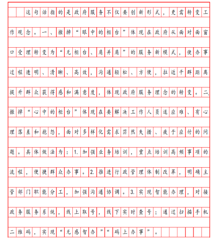 【例】(2022國考行政執(zhí)法)根據(jù)“給定資料2”,談談你對“現(xiàn)在撤掉的是‘眼中的柜臺’,但我們更要在撤掉‘心中的柜臺’上下功夫”這句話的理解。(15分)