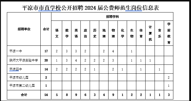 為進(jìn)一步加強(qiáng)市直學(xué)校教師隊(duì)伍建設(shè),補(bǔ)充優(yōu)化教師配備結(jié)構(gòu),平?jīng)鍪薪逃譀Q定在教育部直屬6所重點(diǎn)師范大學(xué)2024屆公費(fèi)師范畢業(yè)生中為相關(guān)學(xué)校公開(kāi)招聘教師54名?,F(xiàn)將有關(guān)事項(xiàng)公告如下。