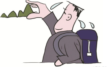 一位背著包的人,滿頭大汗,用手丈量著遠(yuǎn)方的高山,從他的角度高山看著很小,一只手就能比劃過來。但是實(shí)際上這是距離太遠(yuǎn)產(chǎn)生的錯(cuò)覺,山的高遠(yuǎn)不是一只手可以丈量的,到達(dá)山頂,還有很長的路要走,漫畫中的人雖然滿頭大汗很努力,但是沒有講求科學(xué)的方法,仍然會(huì)偏離目標(biāo)。因此,我為這幅漫畫起的三個(gè)標(biāo)題是《有科學(xué)的工作方法》、《眼見未必為實(shí)》、實(shí)踐是檢驗(yàn)真理的唯一標(biāo)準(zhǔn)》。