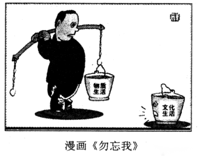 審題點(diǎn)1:“漫畫題,漫畫是一個(gè)人挑著扁擔(dān)后面是物質(zhì)生活,然后有一個(gè)同事問‘文化生活呢?’文化生活被扔在了地上”