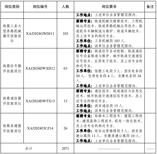 本次計(jì)劃招聘2071人,招聘崗位均為鐵路運(yùn)輸生產(chǎn)一線操作技能崗位。招聘崗位、專(zhuān)業(yè)、工作地點(diǎn)及人數(shù)等內(nèi)容詳見(jiàn)附件。