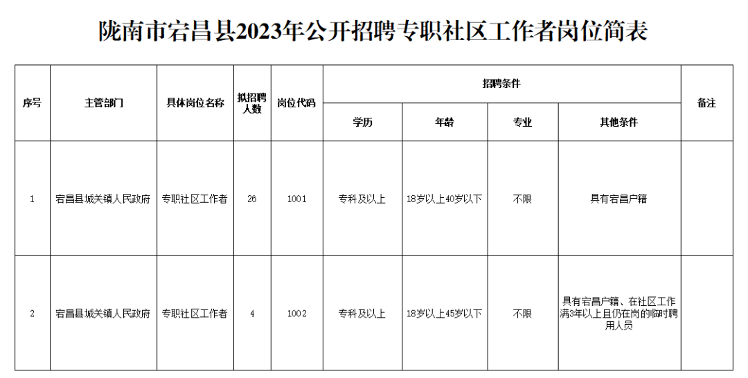 此次擬招聘社區(qū)工作者30名,其中:在未就業(yè)高校畢業(yè)生中招聘26人,社區(qū)工作滿3年以上且仍在崗的臨時聘用人員中招聘4人。具體崗位及要求詳見《隴南市宕昌縣2023年公開招聘專職社區(qū)工作者崗位簡表》(以下簡稱《崗位簡表》)。