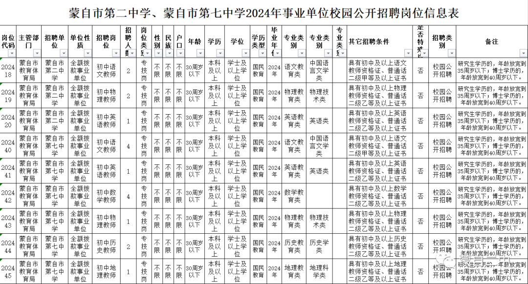 詳見《蒙自市第二中學(xué)2024年校園公開招聘崗位信息表》(附件1)。