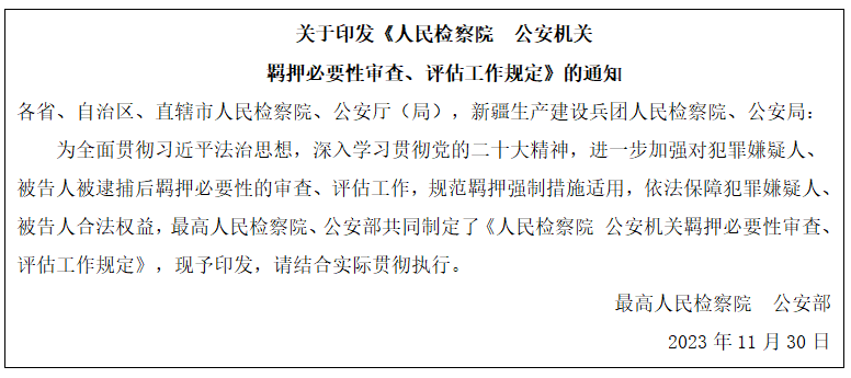 最高檢、公安部聯(lián)合印發(fā)《人民檢察院 公安機(jī)關(guān)羈押必要性審查、評估工作規(guī)定》