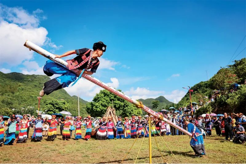 2023年8月10日是彝族傳統(tǒng)節(jié)日火把節(jié),廣西百色市隆林各族自治縣德峨鎮(zhèn)阿搞屯的村民在取火祭火、祭送布谷鳥、打磨秋、抹黑臉、篝火晚會(huì)等民族特色活動(dòng)中歡慶節(jié)日、傳遞祝福。圖為村民展示彝族傳統(tǒng)習(xí)俗——打磨秋。新華社記者胡星宇/攝