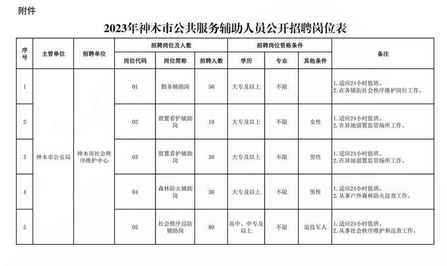 6.招聘崗位具體條件以《2023年神木市公共服務(wù)輔助人員公開招聘崗位表》(附件)的要求為準(zhǔn)。