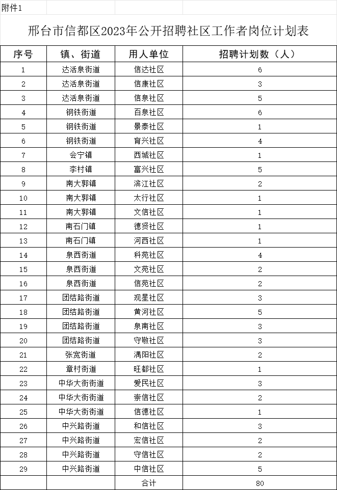 公開招聘社區(qū)工作者共80名,具體崗位計劃詳見《邢臺市信都區(qū)2023年公開招聘社區(qū)工作者崗位計劃表》(附件1)。