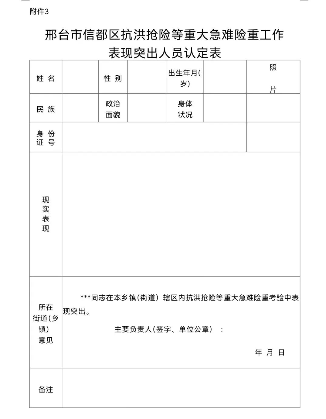 3.《邢臺市信都區(qū)抗洪搶險等重大急難險重工作表現(xiàn)突出人員認定表》