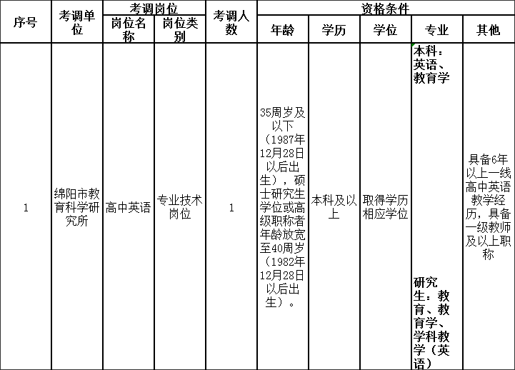 考調(diào)名額1名,招聘對(duì)象為符合本公告和《綿陽(yáng)市教育科學(xué)研究所公開(kāi)考調(diào)專業(yè)技術(shù)人員崗位和條件一覽表》(附件1)所載條件要求的人員。