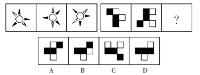 【答案】B【解析】第一組圖形內(nèi)部都是圓,外部角不斷發(fā)生變化,每次都順時針旋轉(zhuǎn)45度,按照類比第一組規(guī)律發(fā)現(xiàn)第二組中間黑方框不變,外部每個小方塊順時針平移一個,故答案選B。