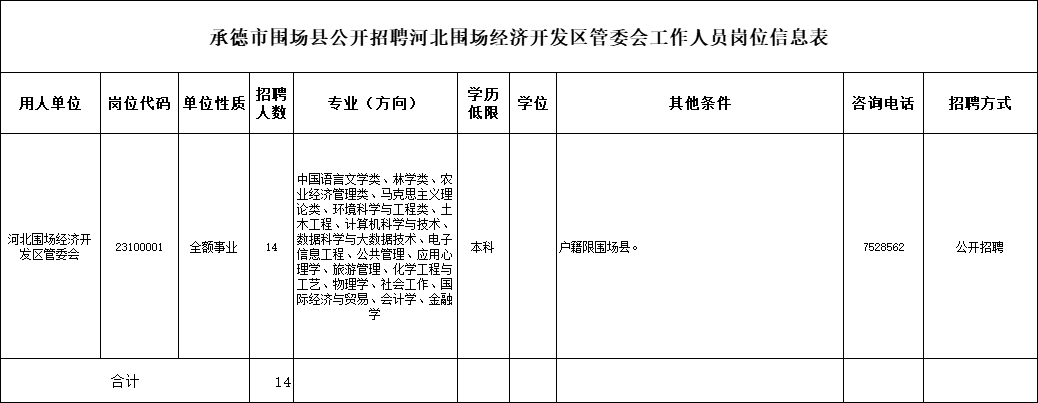 根據(jù)《承德市事業(yè)單位公開(kāi)招聘工作人員暫行辦法》(承人社〔2011〕87號(hào))文件精神,結(jié)合河北圍場(chǎng)經(jīng)濟(jì)開(kāi)發(fā)區(qū)管委會(huì)2023年招聘計(jì)劃和崗位空缺情況,經(jīng)縣委、縣政府研究,決定面向社會(huì)公開(kāi)招聘河北圍場(chǎng)經(jīng)濟(jì)開(kāi)發(fā)區(qū)管委會(huì)工作人員14名,具體方案如下: