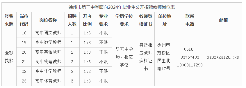 《徐州市第三中學(xué)面向2024年畢業(yè)生公開(kāi)招聘教師公告》在徐州市人力資源和社會(huì)保障局網(wǎng)站(http://hrss.xz.gov.cn)、徐州市教育局網(wǎng)站(http://jyj.xz.gov.cn)、徐州市第三中學(xué)網(wǎng)站(http://www.xz3z.com)發(fā)布,具體的崗位名稱、招聘人數(shù)、資格條件等詳見(jiàn)下表。