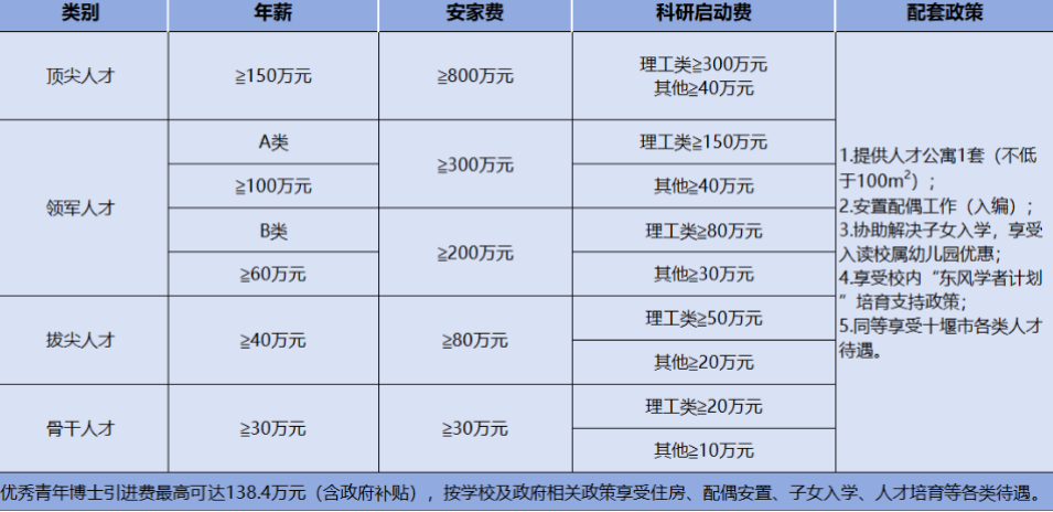 引進(jìn)人才全面享受國家、湖北省和學(xué)校相關(guān)計(jì)劃(項(xiàng)目)配套支持優(yōu)惠政策,符合條件者可依托學(xué)校申報(bào)國家、湖北省人才項(xiàng)目。