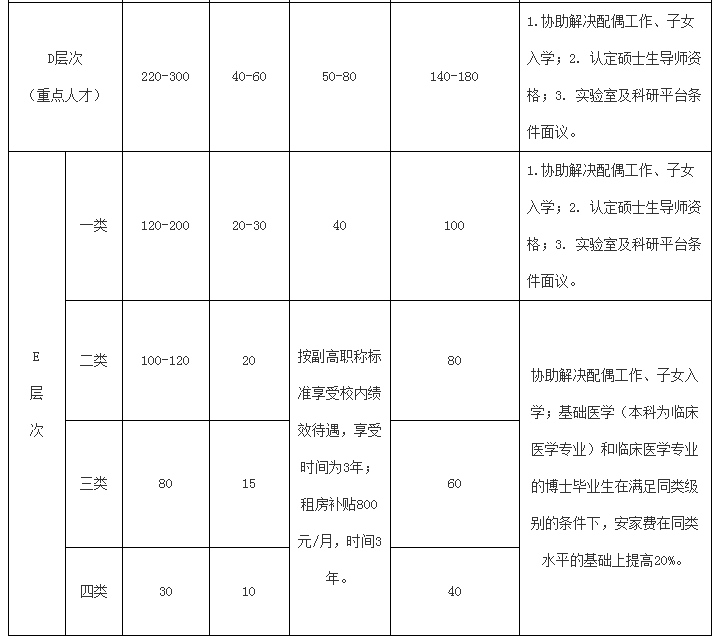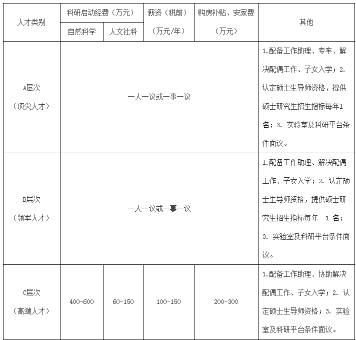 學(xué)校全職引進(jìn)的高層次人才界定為五個(gè)層次,具體分類標(biāo)準(zhǔn)按學(xué)校有關(guān)文件規(guī)定執(zhí)行。全職引進(jìn)的高層次人才,學(xué)校提供科研啟動(dòng)經(jīng)費(fèi)、購房補(bǔ)貼等,標(biāo)準(zhǔn)如下: