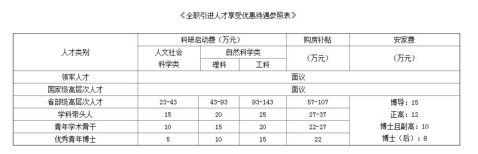 (1)學(xué)校為全職在我校工作的引進(jìn)人才提供博士學(xué)位津貼、安家費(fèi)、購房補(bǔ)貼和科研啟動(dòng)費(fèi)等,安家費(fèi)、購房補(bǔ)貼(分5年支付)和科研啟動(dòng)費(fèi)標(biāo)準(zhǔn)見《全職引進(jìn)人才享受優(yōu)惠待遇參照表》,博士學(xué)位津貼按每月1000元發(fā)放。