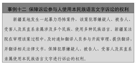 ??——保障使用本民族語(yǔ)言文字進(jìn)行訴訟的權(quán)利。中國(guó)憲法法律賦予各民族公民使用本民族語(yǔ)言文字進(jìn)行訴訟的權(quán)利。司法機(jī)關(guān)審理恐怖活動(dòng)犯罪案件,對(duì)于不通曉當(dāng)?shù)赝ㄓ玫恼Z(yǔ)言文字的訴訟參與人,應(yīng)當(dāng)為他們翻譯。在少數(shù)民族聚居或者多民族雜居的地區(qū),應(yīng)當(dāng)用當(dāng)?shù)赝ㄓ玫恼Z(yǔ)言進(jìn)行審訊,用當(dāng)?shù)赝ㄓ玫奈淖职l(fā)布判決書、布告和其他文件。在民族自治地方,人民法院和人民檢察院應(yīng)當(dāng)用當(dāng)?shù)赝ㄓ玫恼Z(yǔ)言審理和檢察案件,并合理配備通曉當(dāng)?shù)赝ㄓ玫纳贁?shù)民族語(yǔ)言文字的人員,法律文書應(yīng)當(dāng)根據(jù)實(shí)際需要,使用當(dāng)?shù)赝ㄓ玫囊环N或者幾種文字。