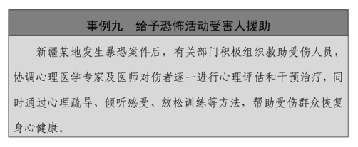 ??——保障受害人和其他利害關(guān)系人的權(quán)利。中國(guó)在應(yīng)對(duì)處置恐怖事件時(shí),優(yōu)先保護(hù)直接受到恐怖活動(dòng)危害、威脅人員的人身安全,組織營(yíng)救和救治受害人員,疏散、撤離并妥善安置受到威脅的人員;應(yīng)對(duì)處置結(jié)束后,組織有關(guān)部門幫助受影響的單位和個(gè)人盡快恢復(fù)生活、生產(chǎn),穩(wěn)定受影響地區(qū)的社會(huì)秩序和公眾情緒,及時(shí)給予恐怖事件受害人員及其近親屬適當(dāng)?shù)木戎?,提供心理、醫(yī)療等方面的援助,并向失去基本生活條件的受害人員及其近親屬及時(shí)提供基本生活保障。