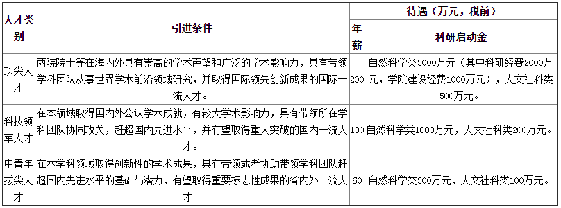 引進的高層次人才分為三個類別,分別是頂尖人才、科技領(lǐng)軍人才和中青年拔尖人才。具體引進范圍如下,待遇不低于以下標準: