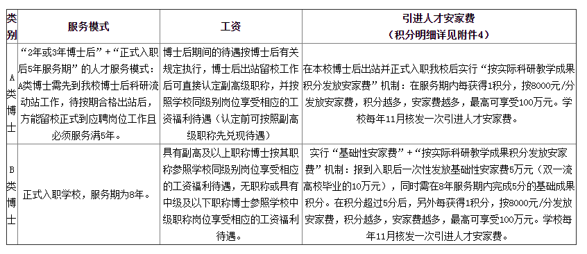 不同類別博士的條件、服務(wù)模式與工資待遇不一樣,最高可以拿到100萬元引進(jìn)人才安家費(fèi),具體如下: