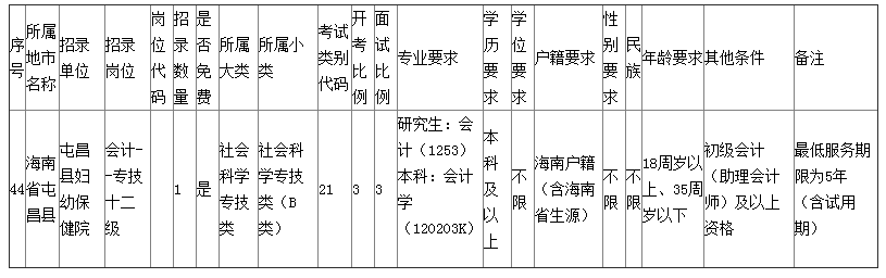 一、招聘崗位條件更正。屯昌縣婦幼保健院會計--專技十二級招聘崗位條件中的所屬大類、所屬小類和考試類別代碼分別由原來的“醫(yī)療衛(wèi)生類、醫(yī)學技術(shù)崗位(E類)、55”相應修改為“社會科學專技類、社會科學專技類(B類)、21”;年齡要求由“18周歲以上、35周歲以下(中級放寬至40歲,高級放寬至45歲)”修改為“18周歲以上、35周歲以下”。更正后該崗位招聘條件如下: