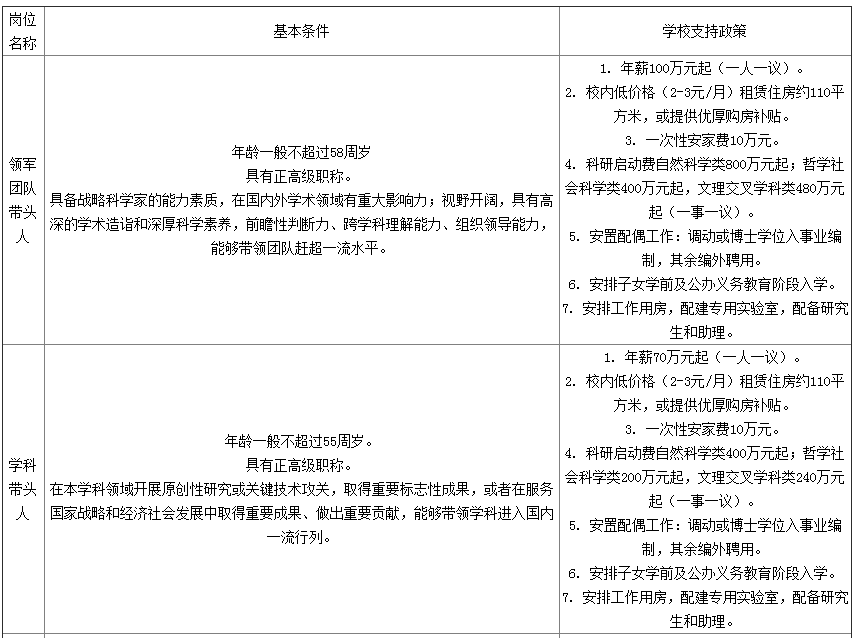 (3)C層次人才:生活補助每年20萬元,連續(xù)發(fā)放5年;一次性購房補助100萬元;科研補助每年自然科學類60萬元、哲學社會科學類20萬元,連續(xù)補助5年。
