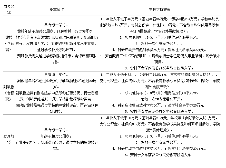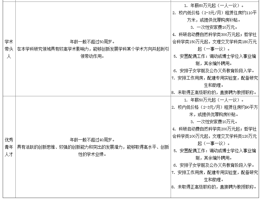 (5)E層次人才:生活補助每年10萬元,連續(xù)發(fā)放3年;一次性購房補助50萬元;科研補助每年自然科學類15萬元、哲學社會科學類8萬元,連續(xù)補助3年。