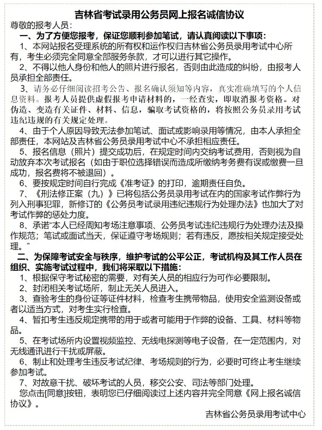 3、考生認(rèn)真閱讀‘吉林省考試錄用公務(wù)員考生誠信須知’(如圖1-3)后,點(diǎn)擊‘同意’即可進(jìn)入登錄及注冊頁面,如果點(diǎn)擊‘不同意’則返回到圖1-1頁面。