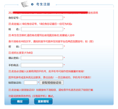 未注冊考生請注冊后再登錄,點(diǎn)擊圖1-4中的‘注冊新用戶’進(jìn)入注冊頁面如圖1-5,請考生按提示填寫注冊信息。點(diǎn)擊‘確定’提交注冊信息,注冊成功后將返回圖1-4頁面進(jìn)行登錄(返回登陸時(shí)自動把身份證號填充到身份證號文本框內(nèi))。