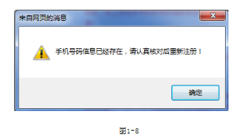 3、相同的手機(jī)號只能成功注冊一次,如重復(fù)使用已注冊成功的手機(jī)號,會提示錯誤,如圖1-8所示: