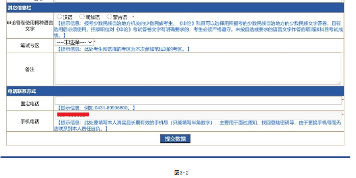點(diǎn)擊圖3-1中‘報(bào)名資料填寫’按鈕會顯示如圖3-2頁面,考生填寫相應(yīng)的信息,帶有‘*’字樣的為必填項(xiàng),填寫完畢后點(diǎn)擊‘提交數(shù)據(jù)’即可。