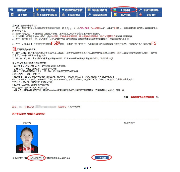1、點(diǎn)擊‘照片上傳’進(jìn)入照片上傳界面,上傳照片前請?jiān)敿?xì)閱讀‘上傳照片要求及注意事項(xiàng)’如圖4-1。