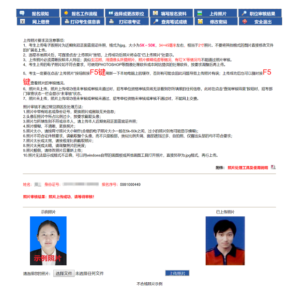 4、點(diǎn)擊‘上傳照片’按鈕,顯示‘已上傳照片,未審核,請等待審核!’如圖4-4,查看照片是否通過,可在圖4-4的頁面進(jìn)行查看??忌牲c(diǎn)擊“不合格照片示例”按鈕查看不符合要求的照片(僅做示例)。