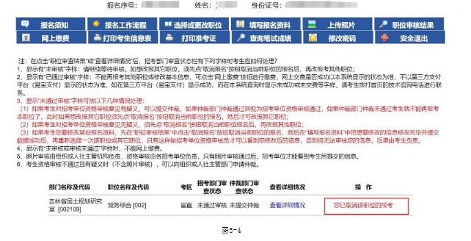 (2、取消報(bào)名后,資格審查結(jié)果列表中將顯示‘已經(jīng)取消報(bào)考該職位’,如圖5-4)