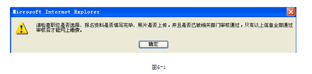 資格審核通過后,即可點(diǎn)擊‘網(wǎng)上繳費(fèi)’進(jìn)行繳費(fèi)操作,如果審核沒通過就會有圖6-1的提示。