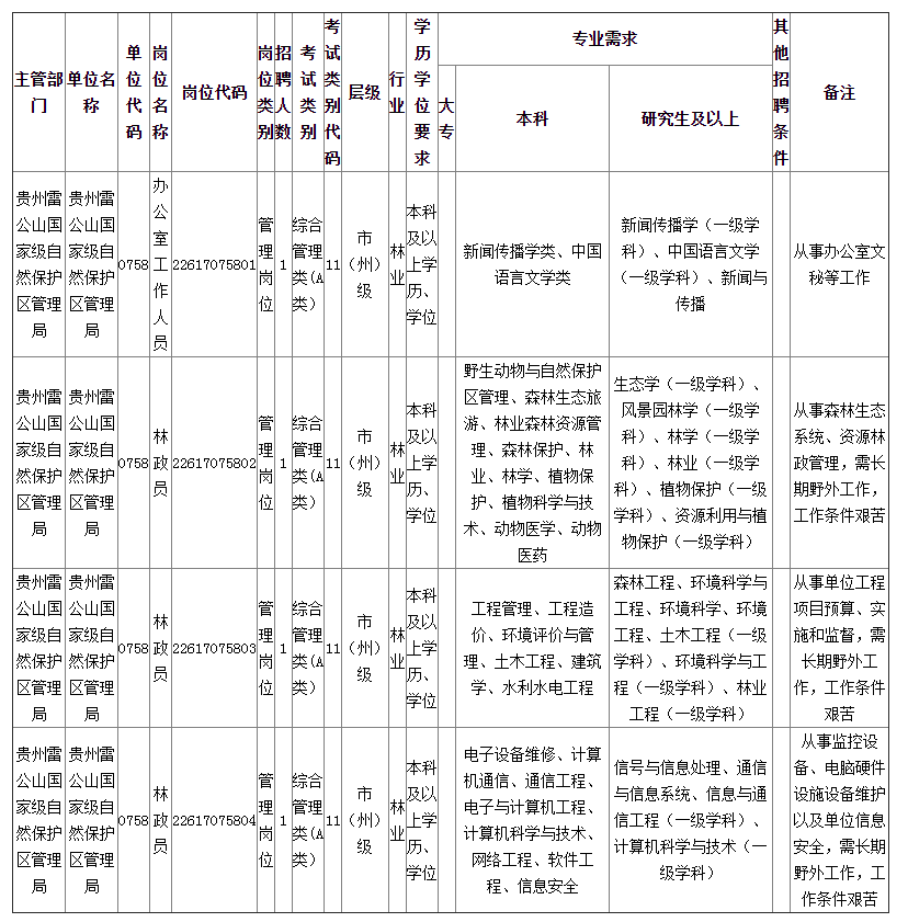 一、貴州雷公山國(guó)家級(jí)自然保護(hù)區(qū)管理局(招聘崗位代碼:22617075801、22617075802、22617075803、22617075804)崗位專業(yè)需求調(diào)整為: