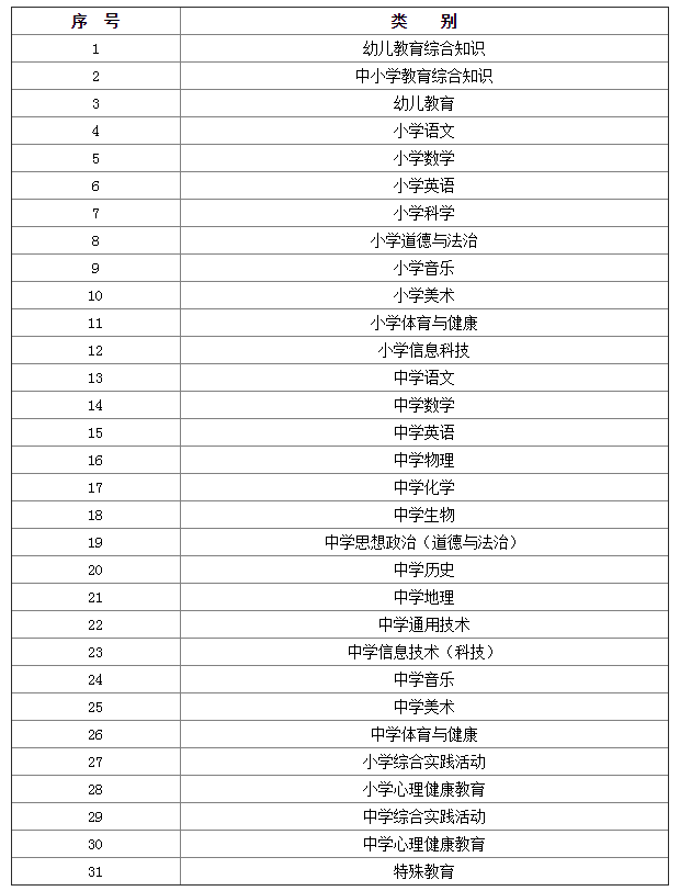 筆試科目:“教育綜合知識”和“專業(yè)知識”。科目類別共設(shè)31個(參見附件),由應(yīng)聘者根據(jù)本人所報考崗位類別選擇其中一個科目類別參加考試;“教育綜合知識”是每位應(yīng)聘者必考科目。