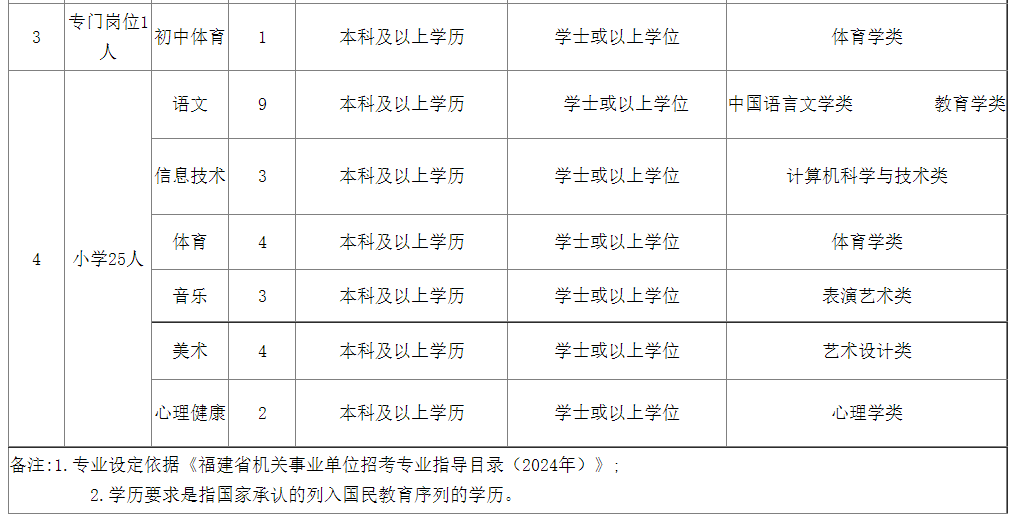 為進一步優(yōu)化師資隊伍結(jié)構(gòu),滿足學校教學需要,促進教育均衡發(fā)展, 根據(jù)《福建省教育廳 中共福建省委機構(gòu)編制委員會辦公室 福建省財政廳 福建省人力資源和社會保障廳印發(fā)<關(guān)于進一步做好全省中小學幼兒園教師補充工作的若干措施>的通知》(閩教規(guī)[2022]3號)及《福建省教育廳 福建省人力資源和社會保障廳關(guān)于2024年全省中小學幼兒園教師公開招聘筆試服務(wù)工作的通知》(閩教師〔2024〕2號)等文件精神,結(jié)合我區(qū)實際,現(xiàn)就我區(qū)2024年公開招聘中小學新任教師方案公告如下: