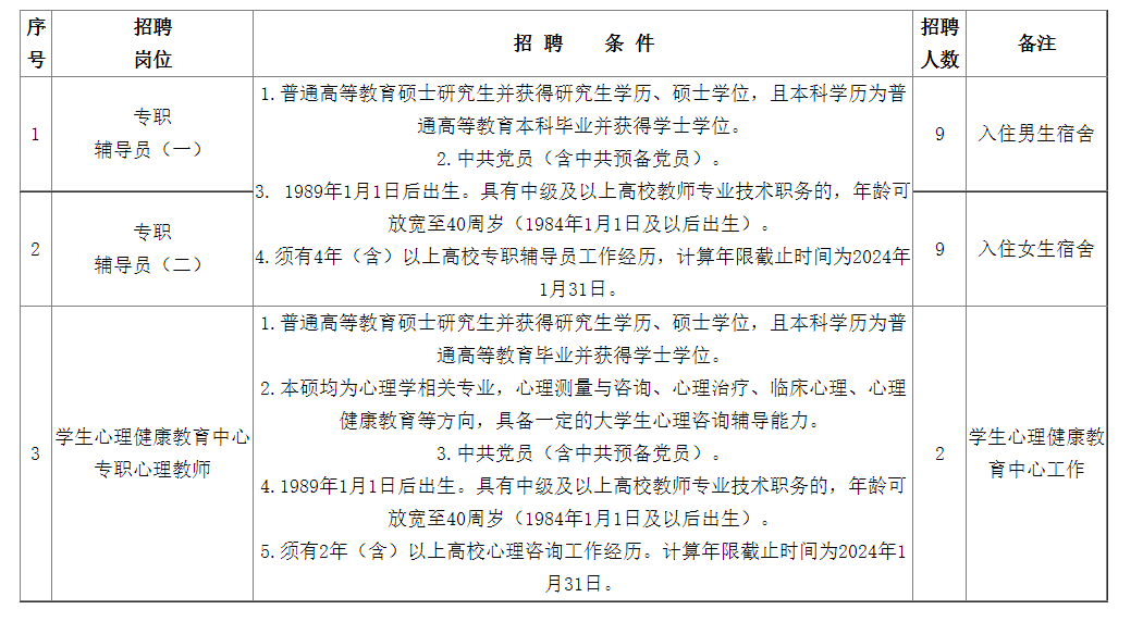 6.應聘專職輔導員崗位須有4年(含)以上高校專職輔導員工作經歷,應聘學生心理健康教育中心專職心理教師崗位須有2年(含)以上高校心理咨詢工作經歷。計算年限截止時間為2024年1月31日。