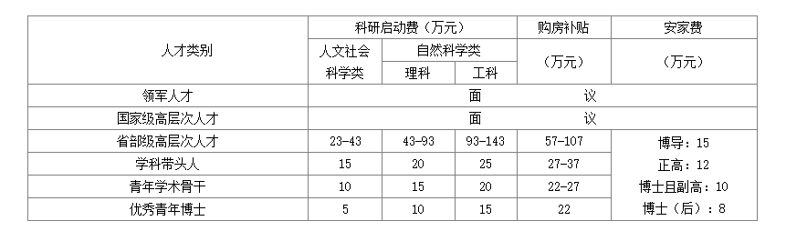 ?。?)學(xué)校為全職在我校工作的引進人才提供博士學(xué)位津貼、安家費、購房補貼和科研啟動費等,安家費、購房補貼(分5年支付)和科研啟動費標準見《全職引進人才享受優(yōu)惠待遇參照表》,博士學(xué)位津貼按每月1000元發(fā)放。