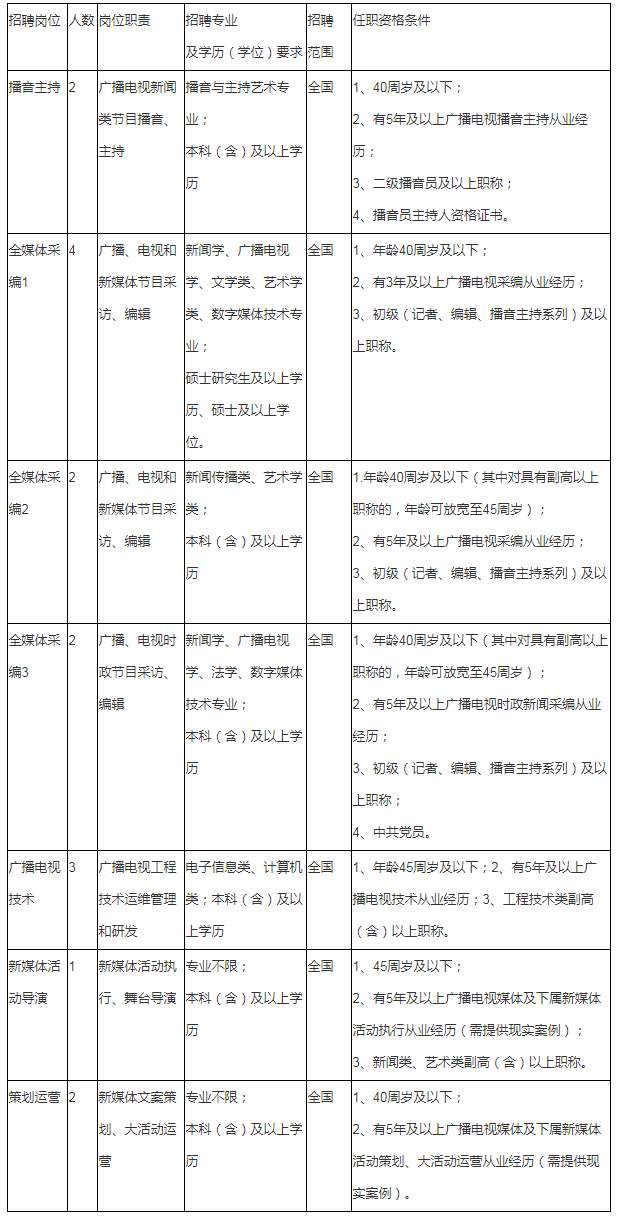 本次招聘考試:播音主持崗位采取“專業(yè)技能測試+面試”的辦法進行,先專業(yè)技能測試再面試;全媒體采編1、廣播電視技術(shù)、新媒體活動導演崗位采取“面試”的辦法進行;全媒體采編2、全媒體采編3崗位采取“筆試+面試”的辦法進行;策劃運營崗位采取“筆試+專業(yè)技能測試+面試”的辦法進行;筆試、專業(yè)技能測試、面試均委托具有考試命題資質(zhì)的獨立第三方機構(gòu)命題。
