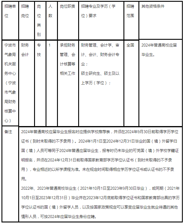 根據(jù)《寧波市事業(yè)單位公開招聘工作人員實(shí)施辦法》有關(guān)規(guī)定,經(jīng)浙江省氣象局同意,寧波市氣象局下屬事業(yè)單位寧波市氣象局機(jī)關(guān)服務(wù)中心(寧波市氣象局財(cái)務(wù)核算中心)決定面向全國公開招聘事業(yè)編制工作人員1名。現(xiàn)就有關(guān)事項(xiàng)公告如下: