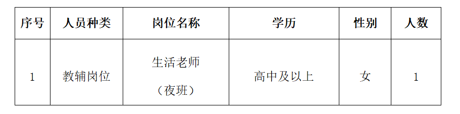 因?qū)W校實(shí)際用人需求,現(xiàn)招聘生活老師1名(女、夜班)。