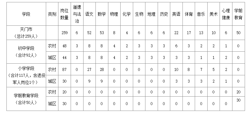 根據(jù)中小學(幼兒園)編制、崗位空缺情況及教育教學需要,2024年天門市共面向社會公開招聘259名中小學(幼兒園)教師,其中初中教師92名(農村初中教師48名、城區(qū)初中教師44名),小學教師117名(農村小學教師87名,城區(qū)小學教師30名),學前教育教師50名(農村學前教育教師20名,城區(qū)學前教育教師30名),其中1個農村小學數(shù)學教師崗位為面向退役軍人招聘崗位,具體崗位如下: