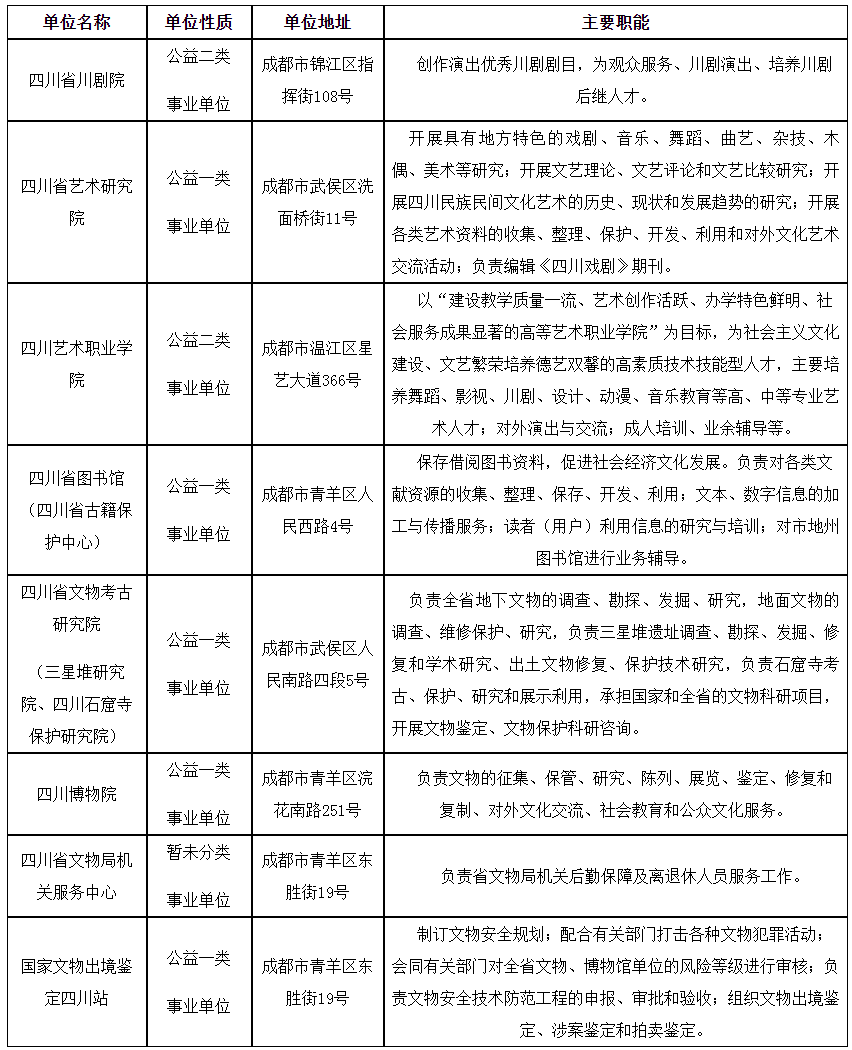 根據(jù)《事業(yè)單位人事管理?xiàng)l例》《事業(yè)單位公開招聘人員暫行規(guī)定》和《四川省省屬事業(yè)單位公開招聘工作人員實(shí)施細(xì)則(試行)》等有關(guān)規(guī)定,四川省文化和旅游廳擬面向社會(huì)公開招聘部分工作人員補(bǔ)充到四川省川劇院等8個(gè)下屬事業(yè)單位工作?,F(xiàn)將公開招聘有關(guān)事項(xiàng)公告如下(本公告由四川省文化和旅游廳同時(shí)在四川省人力資源和社會(huì)保障廳官網(wǎng)[http://rst.sc.gov.cn,下同]“人事考試”專欄和四川省文化和旅游廳官網(wǎng)[http://wlt.sc.gov.cn,下同]上發(fā)布)。