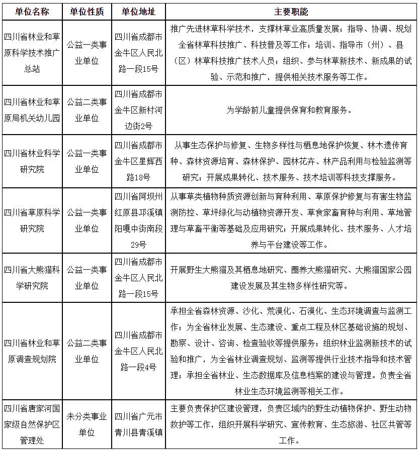 本次招聘均在事業(yè)單位經(jīng)批準(zhǔn)設(shè)置的崗位內(nèi)招聘,招聘名額為42名,其中四川省林業(yè)和草原科學(xué)技術(shù)推廣總站1名、四川省林業(yè)和草原局機關(guān)幼兒園4名、四川省林業(yè)科學(xué)研究院15名、四川省草原科學(xué)研究院6名、四川省大熊貓科學(xué)研究院1名、四川省林業(yè)和草原調(diào)查規(guī)劃院12名、四川省唐家河國家級自然保護區(qū)管理處3名,具體崗位見《崗位和條件要求一覽表》。
