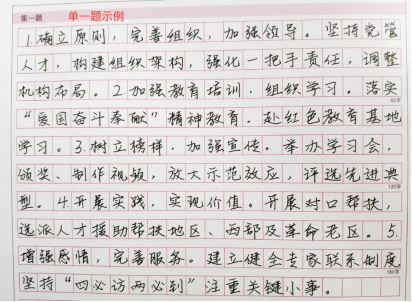 書寫時注意分條撰寫,標(biāo)清序號。一般情況下,單一題需要分條羅列答案要點(diǎn),標(biāo)清序號;綜合題主體分析內(nèi)容最好分條撰寫,標(biāo)清序號。標(biāo)序號時可用一、二、三、……;1.2.3.……等形式,考慮字?jǐn)?shù)有限,建議優(yōu)先使用1.2.3.……。