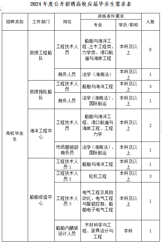 ?。ㄎ澹?yīng)聘高校畢業(yè)生接收計(jì)劃的應(yīng)為2024年應(yīng)屆畢業(yè)生,并如期取得畢業(yè)證書。其中,應(yīng)聘陸地管理崗位的(含救撈工程船隊(duì)商務(wù)人員、海洋工程中心市場(chǎng)營(yíng)銷部商務(wù)員、船舶修造中心船舶內(nèi)舾裝設(shè)計(jì)人員、財(cái)務(wù)核算、人事管理崗),應(yīng)取得2024年度國(guó)家公務(wù)員考試筆試合格成績(jī)。